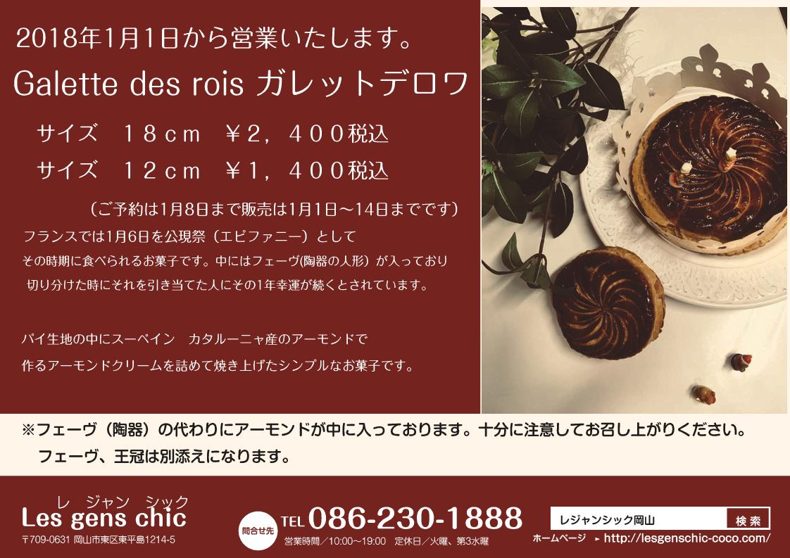 年始からガレットデロワ販売いたします 2025 10/22 未分類 2017-12-252025-10-22 1月1日からガレットデロワ販売いたします。 王様のお菓子で何名様かで切り分けて王様を決めます。 シンプルですがとてもおいしいお菓子でご家族、ご友人と一緒に楽しんでいただけます。 未分類 年末年始営業は休まず営業いたします。 2018年 2月3月限定 ケーキ この記事を書いた人 lesgenschic 関連記事 年末年始営業いたします。 2018-12-07 販売スタッフ募集! 2018-10-15 2018年 2月3月限定 ケーキ 2018-01-13 クリスマスケーキ 2017 2017-11-06 11月3,4,5日1周年記念祭を行います 2017-10-06 6月10.11日 マカロンプレゼント 2017-06-08 バレンタインデー2月14日について 2017-01-24 年末年始の営業について 2016-12-13 コメント コメントする コメントをキャンセルコメント ※ 名前 ※ メール ※ サイト 次回のコメントで使用するためブラウザーに自分の名前、メールアドレス、サイトを保存する。