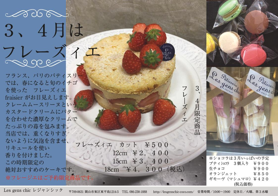 3月と4月の限定 イチゴのお菓子 2025 10/22 お知らせ 2018-03-042025-10-22 3月と4月の限定ケーキのお知らせです。なお、フレーズィエはご予約または、お取り置きされると確実です。 ホワイトデーギフトも数種類ご用意しております。 よろしくお願いします。 お知らせ ひなまつりケーキのご案内 5月の限定ケーキ この記事を書いた人 lesgenschic 関連記事 2025 クリスマスケーキ 2025-10-31 母の日ケーキ レネットの予約販売について 2025-05-06 イートイン営業再開のお知らせ 2025-04-27 ひな祭りケーキ 3/1~3/3 2025-02-25 ボンボンショコラなど 2025-02-03 ガレット デ ロワ 2025-01-07 2024 クリスマスケーキにつきまして 2024-10-25 アイスクリーム 期間限定販売のお知らせ 2024-06-17 コメント コメントする コメントをキャンセルコメント ※ 名前 ※ メール ※ サイト 次回のコメントで使用するためブラウザーに自分の名前、メールアドレス、サイトを保存する。