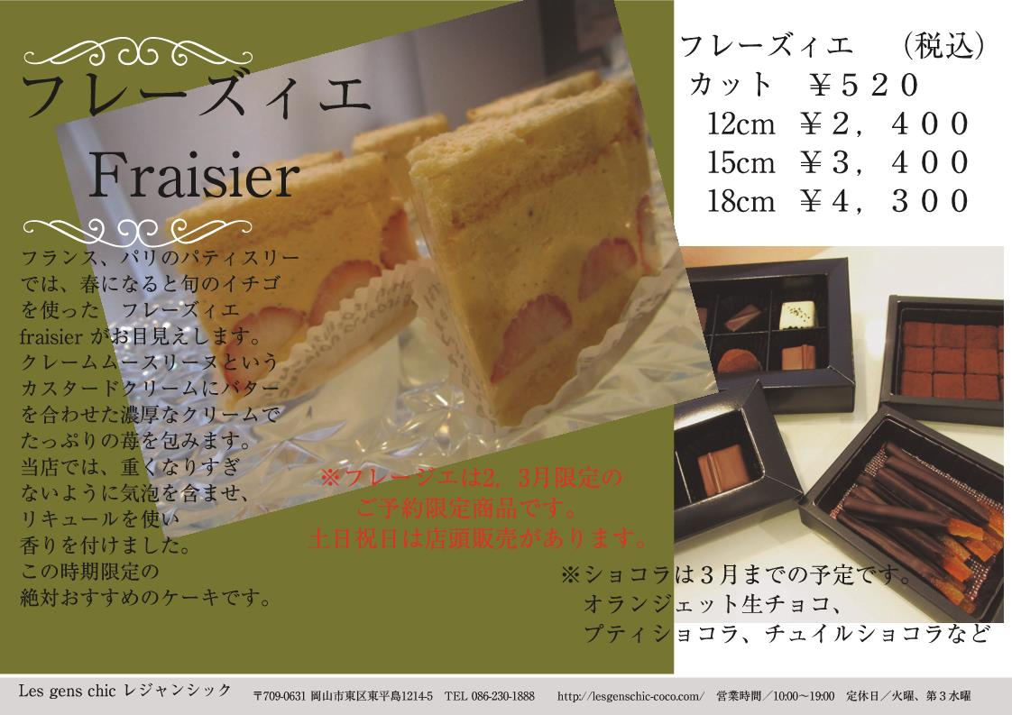 限定菓子フレーズィエ(苺のお菓子)のお知らせ 2025 10/22 お知らせ 2019-01-192025-10-22 ※フレーズィエは3月いっぱい頃まで販売予定の商品です。 土日祝日は店頭販売があります。 平日もご予約いただければご用意できます。 お知らせ ガレットデロワ2019 ショコラ各種の販売開始しました この記事を書いた人 lesgenschic 関連記事 2025 クリスマスケーキ 2025-10-31 母の日ケーキ レネットの予約販売について 2025-05-06 イートイン営業再開のお知らせ 2025-04-27 ひな祭りケーキ 3/1~3/3 2025-02-25 ボンボンショコラなど 2025-02-03 ガレット デ ロワ 2025-01-07 2024 クリスマスケーキにつきまして 2024-10-25 アイスクリーム 期間限定販売のお知らせ 2024-06-17 コメント コメントする コメントをキャンセルコメント ※ 名前 ※ メール ※ サイト 次回のコメントで使用するためブラウザーに自分の名前、メールアドレス、サイトを保存する。