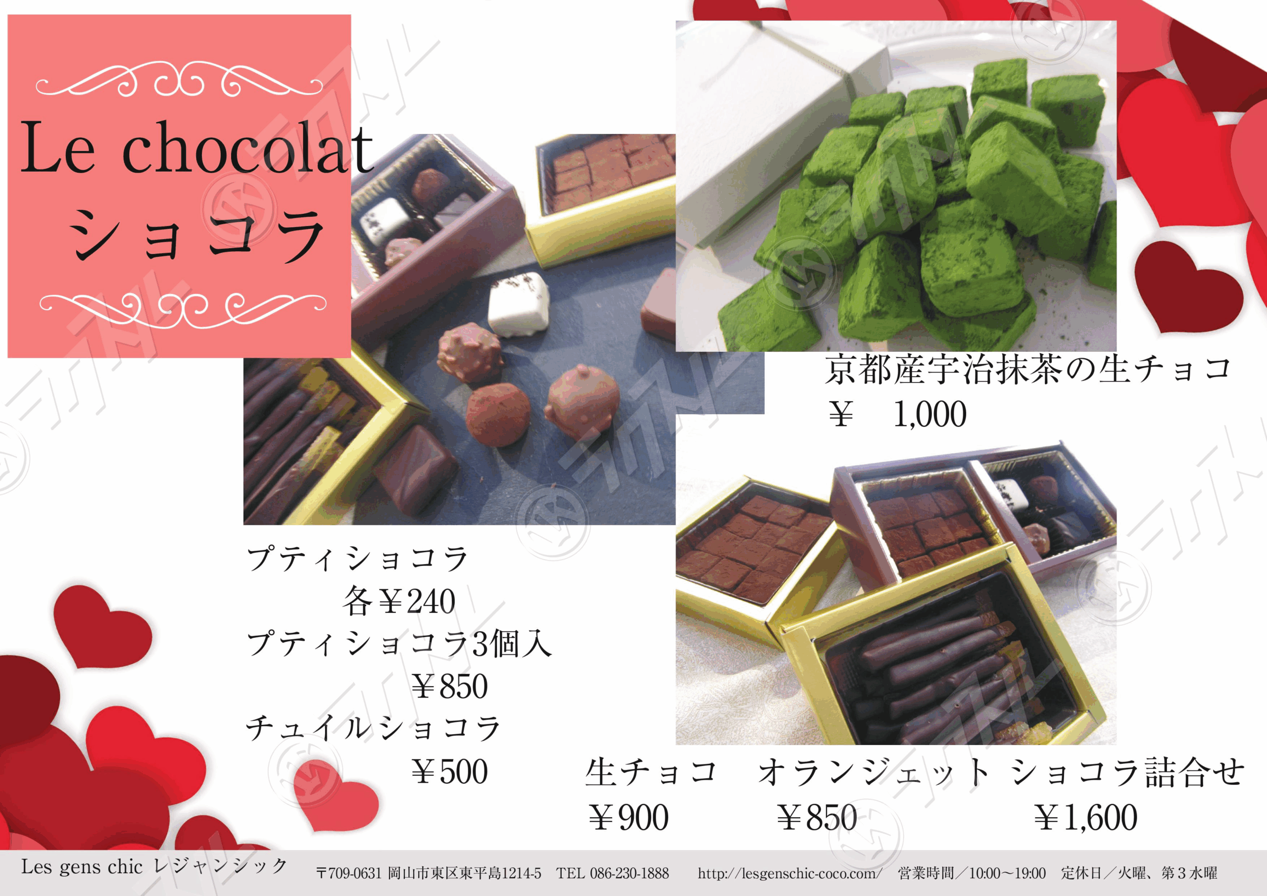 ショコラ各種の販売開始しました 2025 10/22 お知らせ 2019-02-042025-10-22 今年も色々なショコラをご用意しています。バレンタインデーやホワイトデーにお使いいただければと思います。 お知らせ 限定菓子フレーズィエ(苺のお菓子)のお知らせ お雛様ケーキのご案内 この記事を書いた人 lesgenschic 関連記事 2025 クリスマスケーキ 2025-10-31 母の日ケーキ レネットの予約販売について 2025-05-06 イートイン営業再開のお知らせ 2025-04-27 ひな祭りケーキ 3/1~3/3 2025-02-25 ボンボンショコラなど 2025-02-03 ガレット デ ロワ 2025-01-07 2024 クリスマスケーキにつきまして 2024-10-25 アイスクリーム 期間限定販売のお知らせ 2024-06-17 コメント コメントする コメントをキャンセルコメント ※ 名前 ※ メール ※ サイト 次回のコメントで使用するためブラウザーに自分の名前、メールアドレス、サイトを保存する。